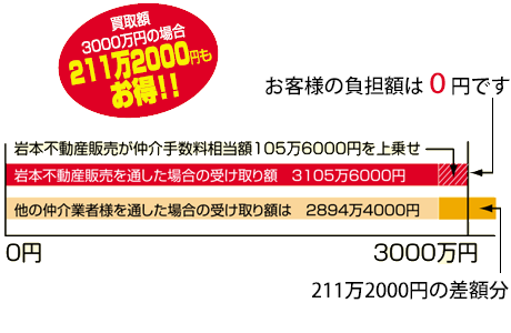 不動産会社を仲介売却する場合、一般的には3%程度の手数料がかかります。3,000万円の物件で約105万円もなりますが、直接買取の場合、この費用が一切かかりません。